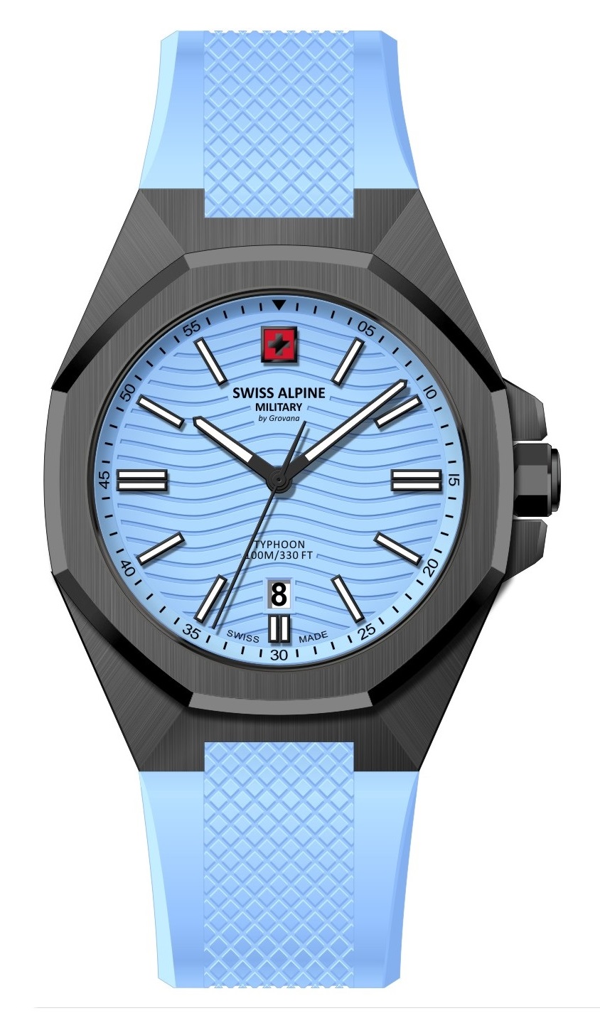 Swiss Alpine Military Typhoon 7006.1871 är ett markant armbandsur för män med en 42 mm boett i rostfritt stål. Den eleganta looken kröns av ett 20 mm brett ljusblått polyuretanarmband. Under det reptåliga safirglaset fanns en ljusblått urtavla med datum vid klockan 6. Klockan drivs av RHQ 515/6 mekanismen. Swiss Alpine Military Typhoon är vattentät till 100m/10atm, vilket gör den lämplig för simning och snorkling, inte för dykning.