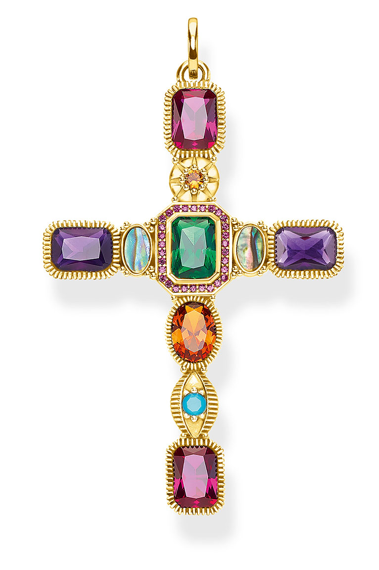 Thomas Sabo Cross berlock PE859-295-7 är dekorerat med färgglada smyckestenar. Korset är tillverkat i 18k gulguldpläterad 925 sterling silver. Berlockens längd är 5,5cm och bredden är 3,3cm. Detta korset passar till både fest och vardag, det är en helt underbar accessoar. Notera att kedjan säljs separat.