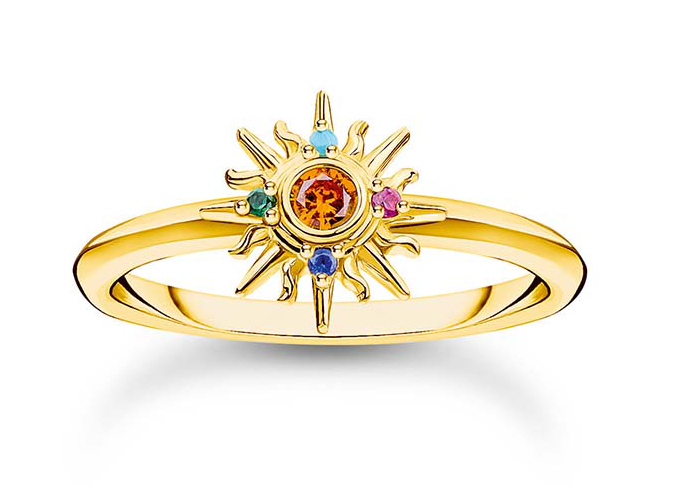 Thomas Sabo Charm Club Charming Festival multicoloured ring TR2458-488-7 är en lyxig ring med en solsymbol och färgglada stenar i mitten. Ytan är behandlad i 18 karats guldplätering. Bär ensam eller matcha med ring i samma serie. Thomas Sabo-ringar levereras i tillverkarens originalförpackning.