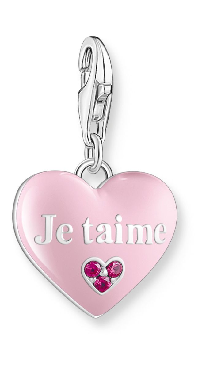 Ge bort ett smycke i Alla hjärtans dag-present. Denna Thomas Sabo Charm Club Charm Paris Charms Je T'aime 2073-042-9 hjärtformade berlock mäter 23,0 mm och har texten Je T'aime på sin yta. Den är tillverkad i sterlingsilver.