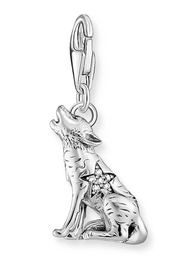 Thomas Sabo Charm Club varg smycke 2054-643-21 är ett tredimensionellt smycke i form av en ylande varg. Vargsmycket har en detaljerad design med graverade linjer, en måne och stjärna dekorerade med stenar. Storlek 11,0 x 26,0 mm. Thomas Sabo smycken levereras i tillverkarens originalförpackning.