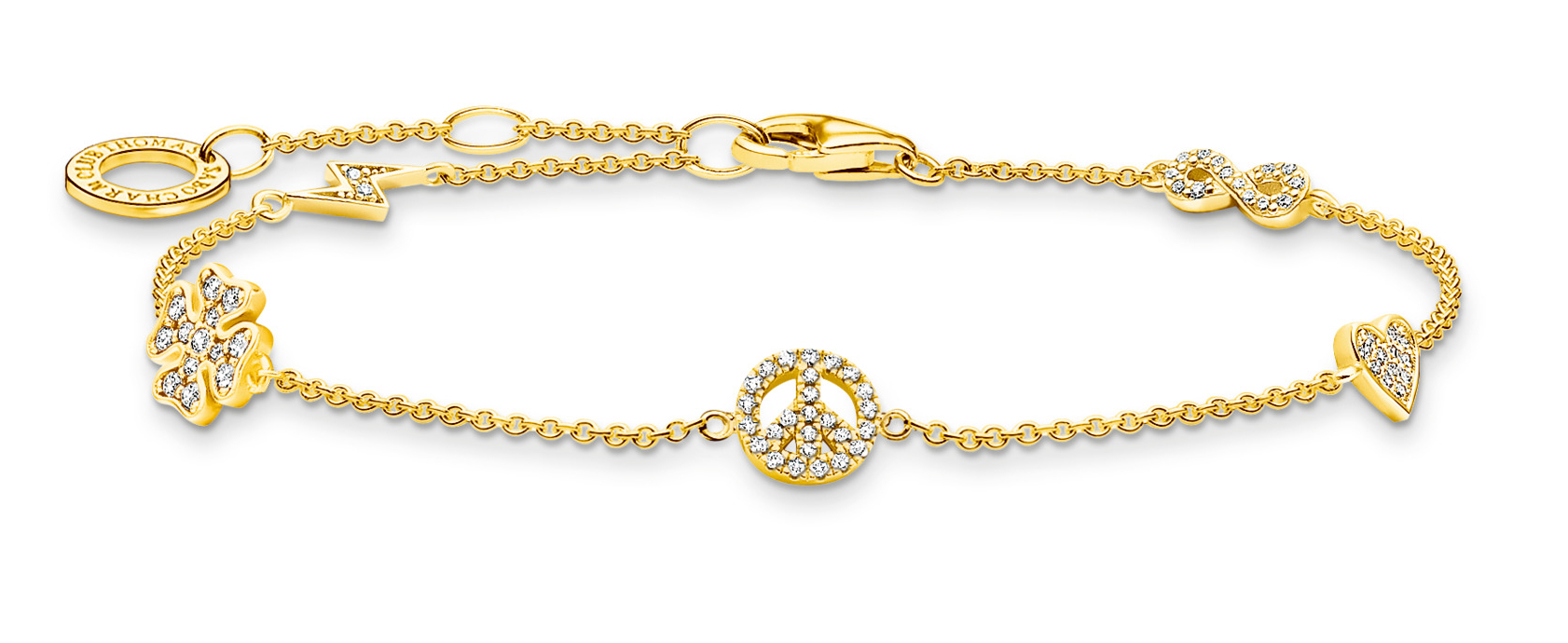 Thomas Sabo Charming Symbols gold B15A2039-414-14-L19V armband med 18K guldplätering och lyckosymboler som ger dig lycka, optimism och glädje. Kedjan är justerbar mellan 16-19 cm. Thomas Sabo smycken skickas hem i tillverkarens originalförpackning.