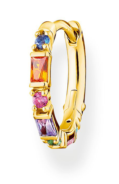 Ett tidlöst örhänge singel hoop CR666-488-7 från Thomas Sabo smyckad med baguette slipade kubisk zirkoner, syntetiska korunder och glasstenar. Örhängen är i 18K guldpläterad sterling silver, diameter 1,4 cm. Säljs styckvis. Thomas Sabo smycken levereras i tillverkarens originalförpackning.