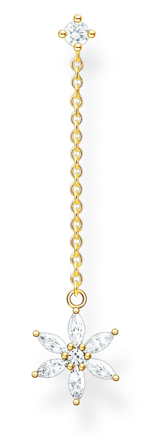 ‌Thomas Sabo flower white stones gold H2198-414-14 singel örhänge. Tillverkad i sterling silver och dekorerad med vita kubisk zirkonia stenar. Höjd 3,2 cm. OBS! säljs styckvis. Thomas Sabo smycken levereras i tillverkarens originalförpackning.