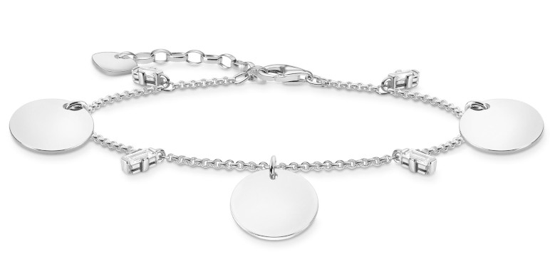 Thomas Sabo wih three discs and white stones silver armband A1962-051-21-L19V. En vacker accessoar som kan bli väldig personlig med graveringen. Platsen för graveringen finns på dom tre berlockerna (max 10 tecken/berlock). Smycket är tillverkat sterling silver och längden på det är justerbar mellan 16-19cm. Smycket är dekorerad med baquette slipade zirconia. Thomas Sabo smycken levereras i tillverkarens originalförpackning.