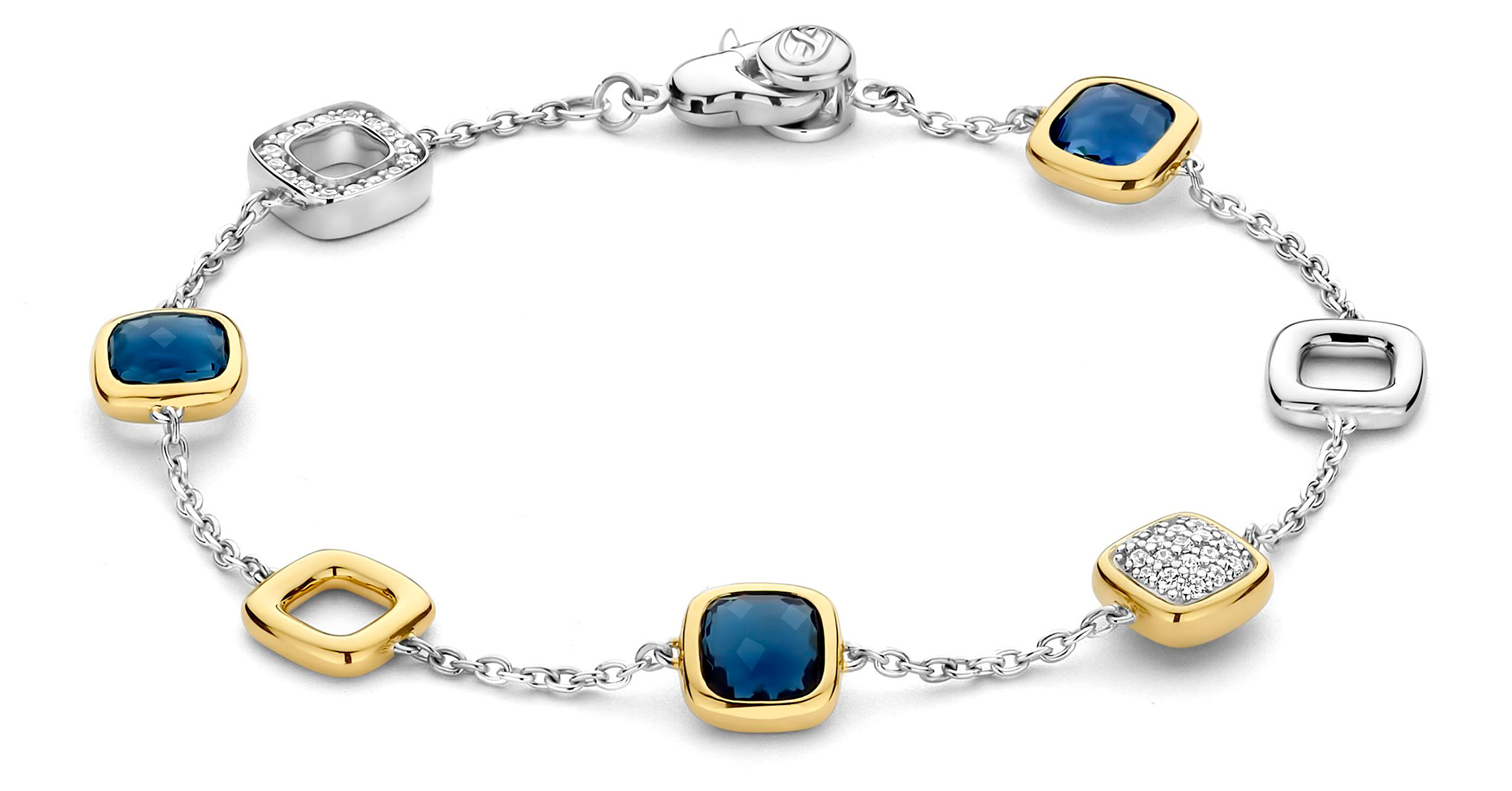 TI SENTO 23080DB-armbandet är experttillverkat av högkvalitativt 925 sterlingsilver. Armbandet har en delikat kedja prydd med en dynamisk kombination av kuddformade berlocker, som var och en erbjuder en unik berlock. Djupblå stenar pläterade i gult guld ger en rik, lyxig kontrast och de öppna, guldpläterade länkarna ger en modern stil, medan pavéinfattade zirkoniadetaljer skapar en skimrande glans som fångar ljuset med varje rörelse. Platinapläterade silverlänkar kompletterar armbandets utseende - detta armband är den perfekta kombinationen av både modern och tidlös berlock. Nickelfritt och allergivänligt, armbandet erbjuder lyxig komfort vid varje användning. Armbandets längd 14,0 cm - 15,4 cm. Stenstorlek 9 mm.