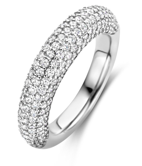 TI SENTO silverring 12287ZI/56 har storlek 56 (17,8 mm) och är dekorerad med en fransk pavéinfattning med flera briljantslipade stenar. Infattningen garanterar att smycket reflekterar ljuset på ett vackert sätt, och ringen med flera rader ser spektakulär ut i alla situationer. Ringens bredd är 5 mm och skenan är gjord av rhodinerat sterling silver. Rhodiumplätering motverkar att smycket oxiderar. TI SENTO-smycken har 2 års garanti som täcker tillverknings och materialfel, och de levereras i tillverkarens originalförpackning.