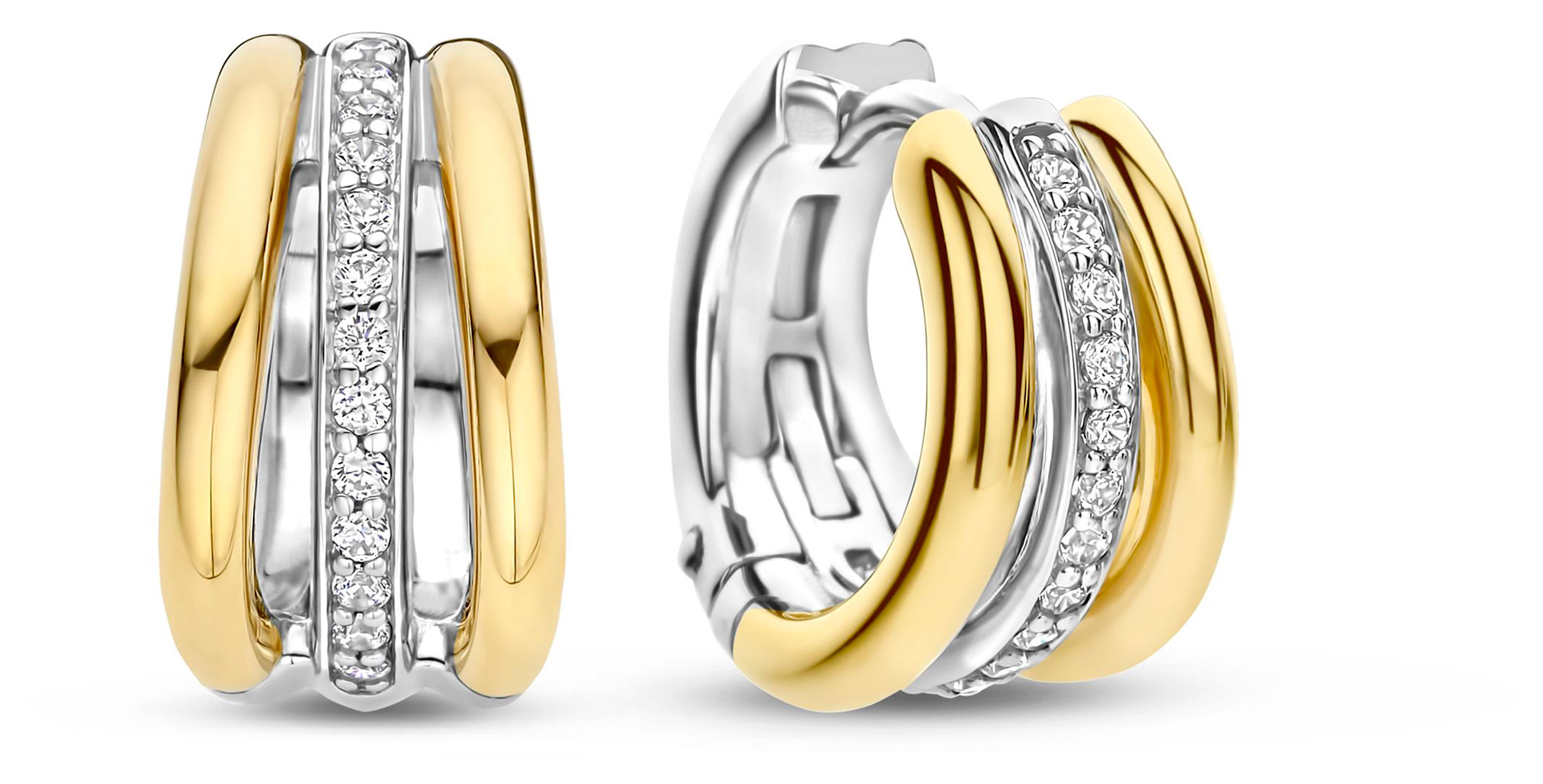 TI SENTO 78010ZY guldpläterade örhängen är tillverkade av förstklassigt 925 sterling silver och har en slående trippeldesign – två eleganta gula guldpläterade ringar som omger en platinapläterad mittring prydd med pavé-set zirkoner. Denna unika struktur skapar en skiktad, dimensionell effekt som gör att dessa örhängen verkligen sticker ut. Nickelfria och hypoallergena, dessa örhängen garanterar lyxig komfort vid varje slitage. Örhängena är 13 mm långa och 14 mm breda.