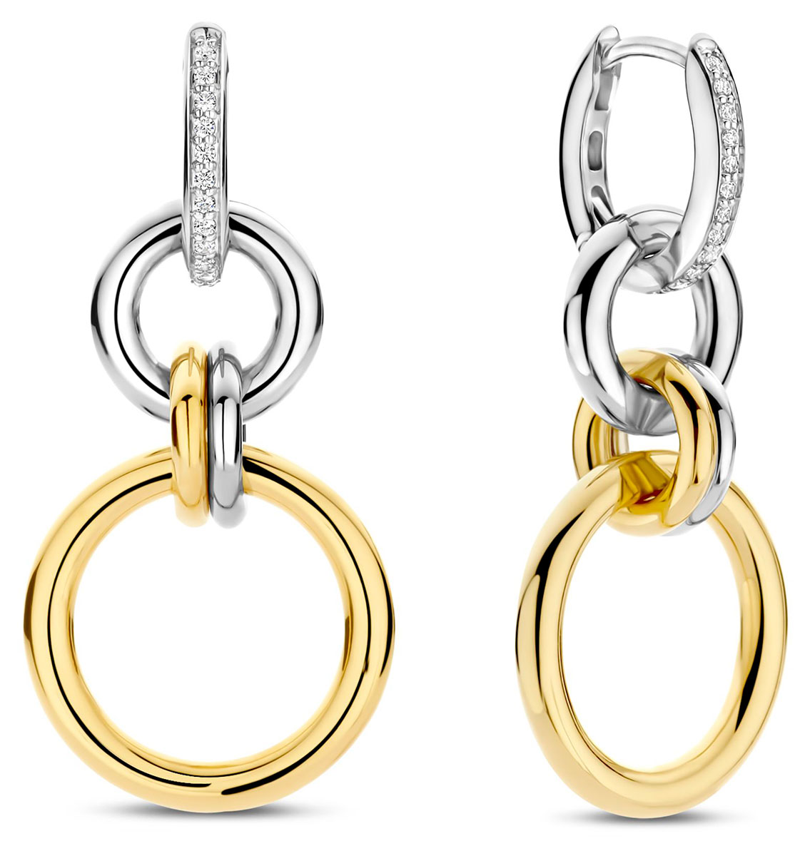 TI SENTO 7989DB guldpläterade örhängen är en djärv tolkning av modern elegans, inklusive tidlös sofistikering. Örhängena, täckta med gult guld och gjorda av högkvalitativt 925 sterling silver, har pavéimplanterade klara zirkoner i den översta ringen, vilket ger örhängena en extra gnistra. Nickelfria och hypoallergena, dessa örhängen garanterar lyxig komfort vid varje slitage. Längden på örhängena är 32 mm, diametern på ringarna är 15 mm och bredden är 2 m.