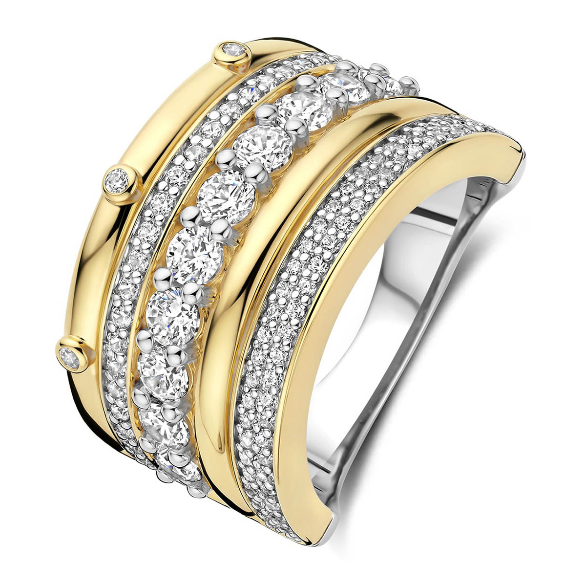 TI SENTO 12396ZY är en slående guldpläterad ring med en bred topp dekorerad med gnistrande zirkonia. Den mellersta raden innehåller större briljantslipade zirkoniastenar, vilket ger ringen ännu mer gnistra. Ringen är tillverkad av 925 sterlingsilver och är nickelfri och allergivänlig, vilket garanterar varaktig komfort och kvalitet. Bredden upptill är 14 mm och nedtill är 3 mm. Välj den storlek som passar dig från rullgardinsmenyn!