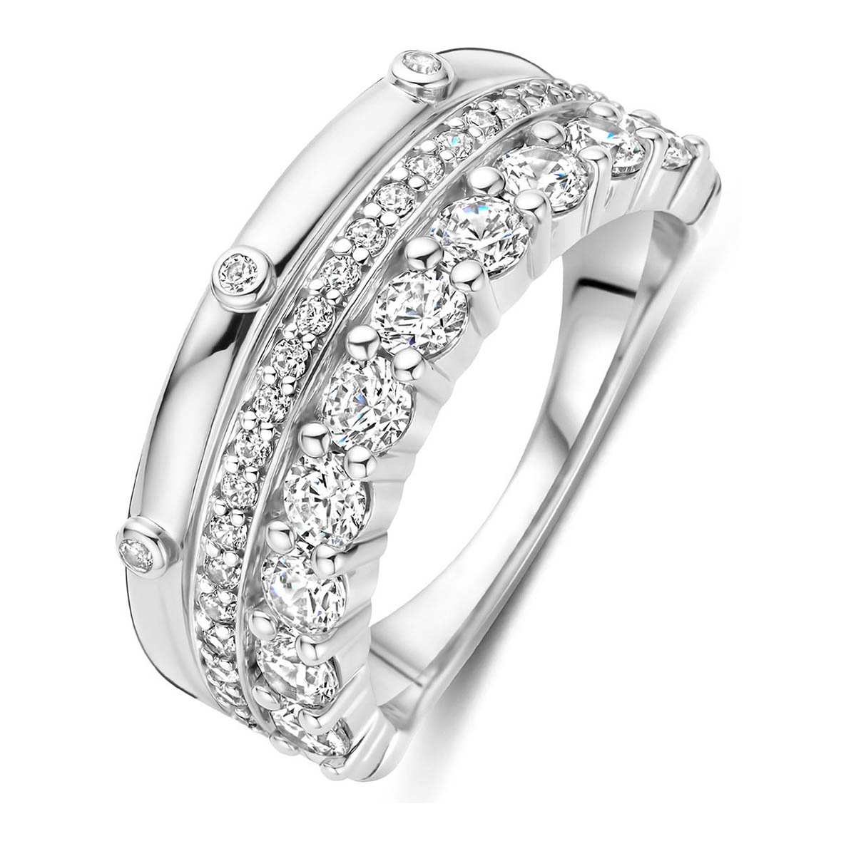 TI SENTO 12397ZI är en sofistikerad och lyxig silverring som passar som en prålig accessoar för både fester och vardagsliv. Ringen har tre lager dekorerade med ljusa zirkonier i varierande storlekar. Tillverkad av 925 sterlingsilver och avslutad med en platinabeläggning som bevarar sin gnistra och förhindrar slitage. Denna nickelfria och allergivänliga ring är noggrant utformad för känslig hud, vilket garanterar varaktig komfort och kvalitet. Ringbredden är 8 mm upptill och 2 mm nedtill.