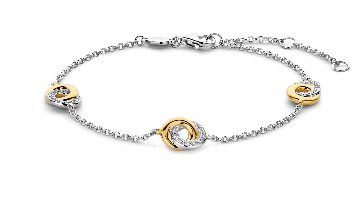 TI SENTO tvåfärgat armband med zirkonia 2925ZY är en modern accessoar med en guld- och silverfärgad sammanlänkad ringar och klara zirkonia.