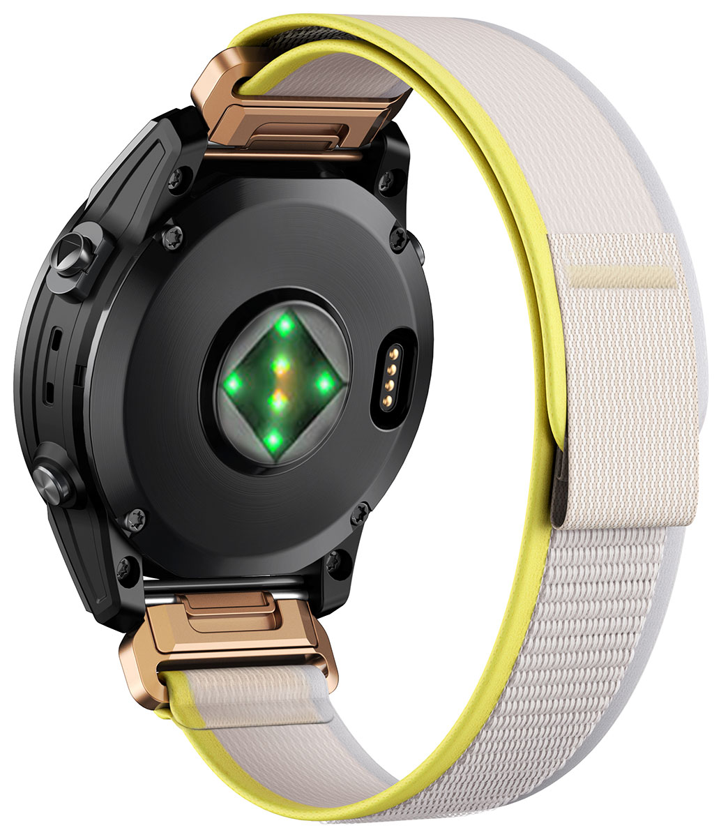 Tiera Garmin Fenix beige Nylon Loop klockarmband 20 mm med QuickFit är ett riktigt snyggt nylonarmband till Garmin smartklockor med 20 mm QuickFit-mekanism. Klockarmbandets infästning är mycket lik Garmins QuickFit-mekanism. Armbandets snabbkoppling gör det enkelt att fästa och lossa armbandet utan verktyg. Kompatibla smartklockor inkluderar Garmin Fenix 5S, Garmin Fenix 6S och Garmin Fenix 7S. Armbandet har en praktisk kardborrebandsfästning för enkel justering. Det är också mycket lätt och enkelt att rengöra. Klockarmbandet levereras med 1 års garanti. Garantin täcker defekter i material och tillverkning. Klockarmbanden är inte tillverkad av Garmin. Det är ett tillbehörsarmband.