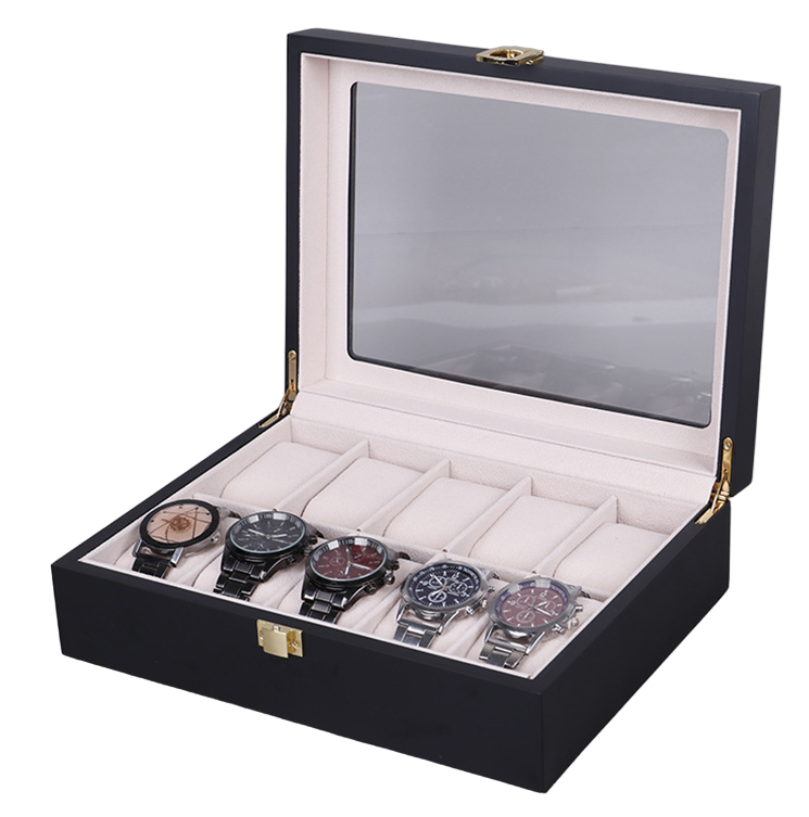 Tiera klocklåda för 10 klockor svart i träd med flexibla klockkuddar i ljus textilyta. Elegant klockskrin med plats för 10 klockor. Storlek 9 x 39 x 22 cm.