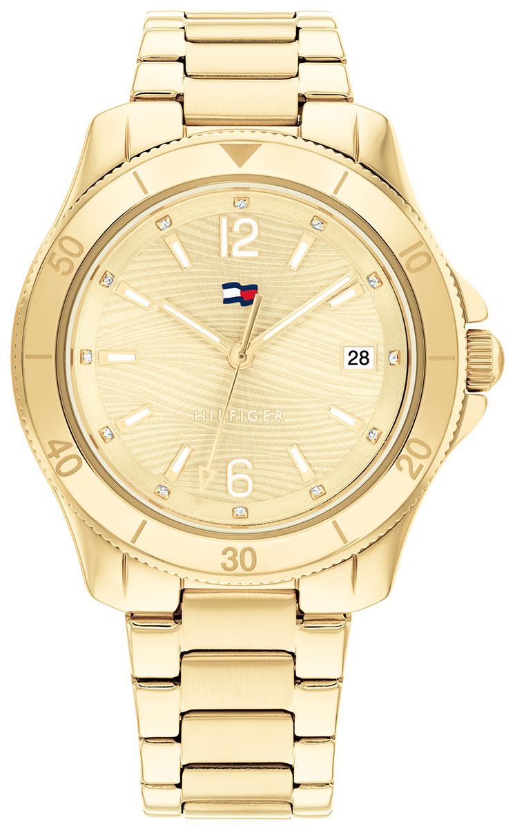 Tommy Hilfiger Brooke 1782513 är en elegant damklocka med en 36 mm bred och 7,7 mm tjock boett i guldfärgat rostfritt stål. Den här klockan har ett guldfärgat rostfritt stålarmband med en bredd på 16 mm vid fästpunkten. Den guldfärgade urtavlan på Tommy Hilfiger 1782513-klockan skyddas av ett mineralglas. Klockan är vattenskyddad till 50m/5atm, vilket innebär att den har begränsad vattentålighet (simning rekommenderas inte). Tommy Hilfiger-klockorna levereras i tillverkarens originalförpackning och har en två års garanti.