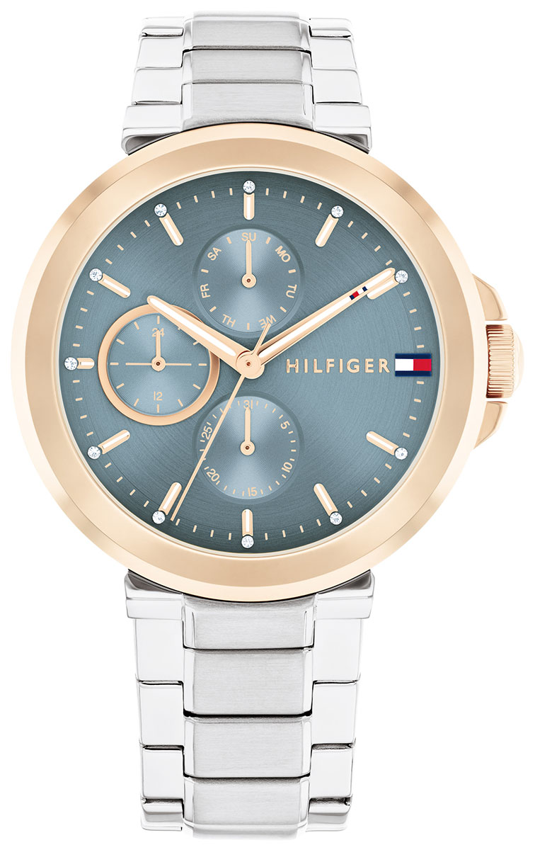 Den tvåfärgade Tommy Hilfiger Lori 1782754 är ett elegant multifunktionsklocka för kvinnor med en roseguldfärgad bezel och en havsblått urtavla med index dekorerade med ljusa kristaller. Perfekt för vardags, denna klockan har en 38 mm bred och 9,7 mm tjock boett i rostfritt stål, och urtavlan har självlysande visare och index. Urtavlan skyddas av ett mineralglas. Mindre subdialer på urtavlan visar 12/24-timmars klocka, datum och veckodagen. Bredden på det silverfärgade stålarmbandet är 19 mm vid fästpunkten. Tommy Hilfiger Lori 1782754 har en vattentålighetsklass på 50m/5atm, vilket innebär att den har begränsad vattentålighet (simning rekommenderas ej). Tommy Hilfiger Lori 1782754 har två års garanti och levereras i tillverkarens originalförpackning.