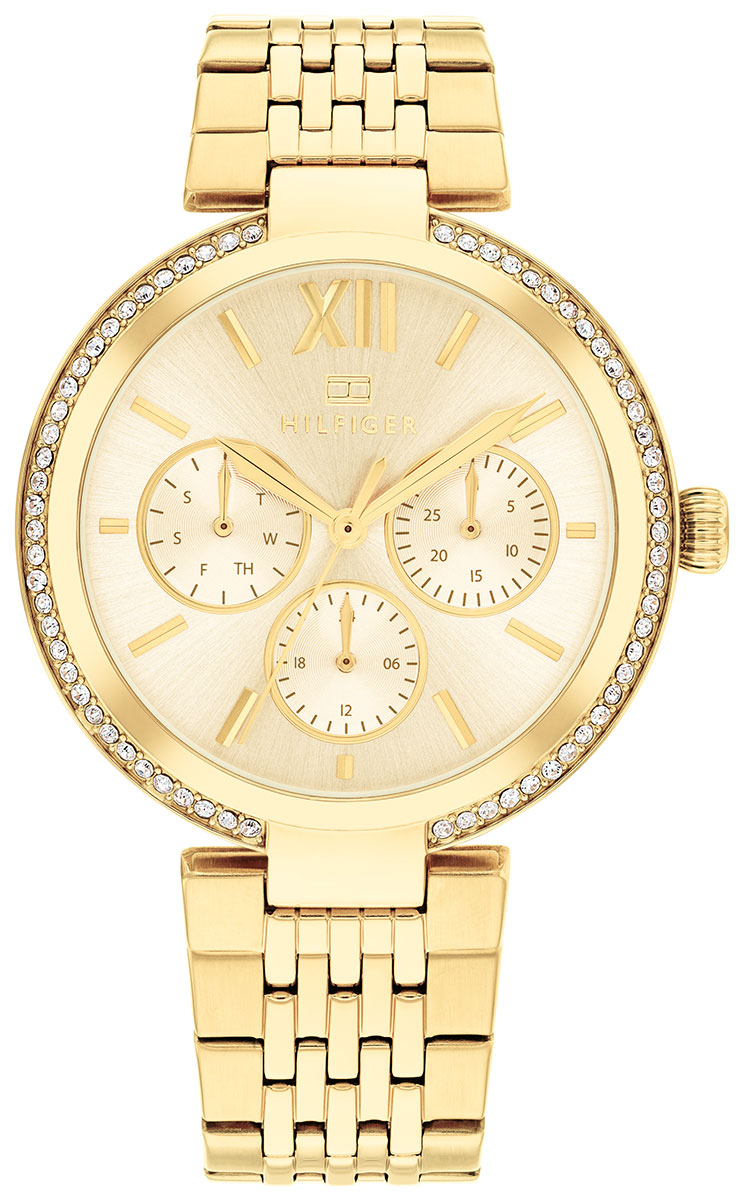 Tommy Hilfiger Sophia 1782697 är en iögonfallande klocka som pryds av gnistrande kristaller. Denna helt guldfärgade klockan har en boett i rostfritt stål som är 36 mm bred och 8,3 mm tjock, och ett armband i rostfritt stål med en bredd på 18 mm vid fästpunkten.
