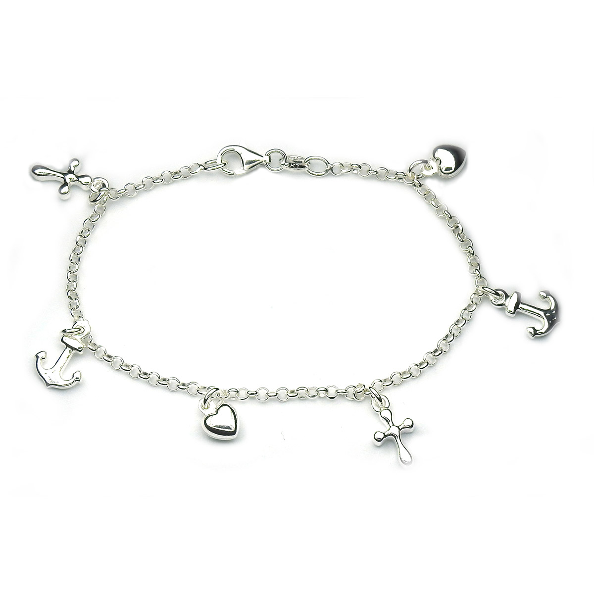 Silverarmbandet Faith-Wish-Love består av en graciös kedja med 6 symboler hängande från den. Två kors, två ankare och två hjärtan. Dessa symboliserar tro, hopp och kärlek. Armbandet är tillverkat i silver och mäter 18,5 cm i längd. Det är en utmärkt gåva till en ung person eller ett barn. Det är också lämpligt som en biktgåva.