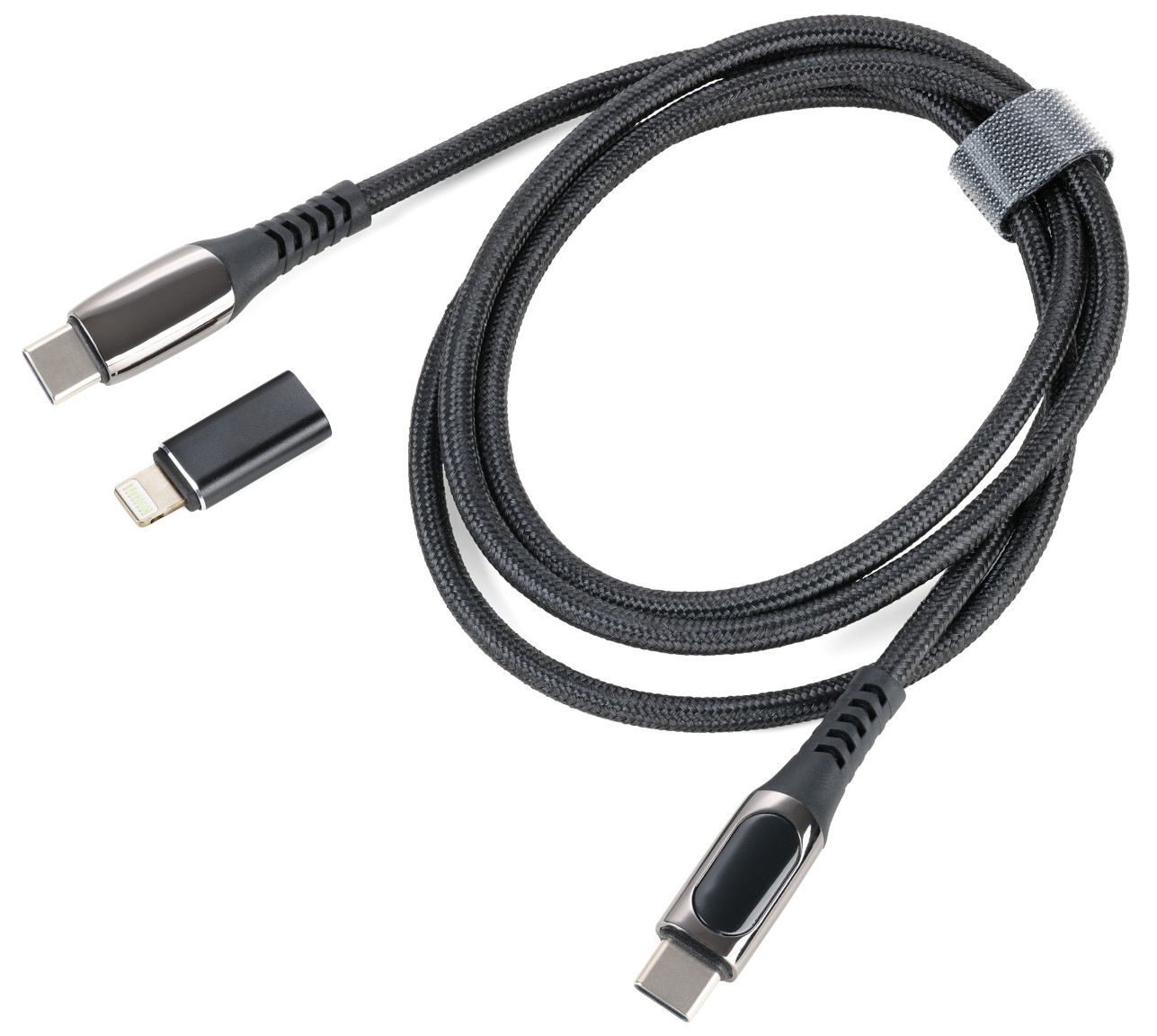 Troika Speedy CBL10/BK USB-C-laddningskabel erbjuder dataöverföring, strömförsörjning och anslutningsmöjligheter för smartphones, surfplattor och bärbara datorer. Troika Speedy USB-C-kabeln stöder upp till 100W effekt. Förpackningen innehåller en Lightning-adapter för laddning av iPhone- och iPad-enheter. Kabeln är utrustad med en liten digital display som visar laddningseffekten. Kabeln är täckt med ett flätat hölje.