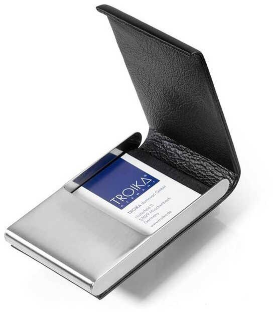 Troika Business Card Holder är en enkel, smart korthållare som är mycket praktisk för dig som ofta bär med dig visitkort eller helst betalar med betalkort. Den är designad i Tyskland och tillverkad i äkta läder och rostfritt, polerat stål. Det går att välja färg på insidan av korthållaren och det finns svart, rött samt blått att välja mellan. Ett starkt, magnetiskt lås ser till att fodralet är stängt. Yttre mått: 60 x 103 x 18 mm. Tomvikt 98 gram.