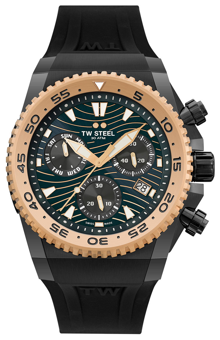 TW Steel Ace Diver Limited Edition ACE413 är en stilren schweizisk dykare med kronograf komplikation. Klockan har en stor boett på 44 mm, stora tryckknapparna på högre sidan, en vridbar krans, och tre undertavlor för tidtagning. Boetten är i PVD pläterad 316L kirurgisk stål och urtavlan är täckt med en slitstark safirglas. Boetten är matchad med ett svart silikonrem. På insidan tickar ett Ronda Z60 urverk. Detta TW Steel Ace Diver Limited Edition ACE413 dykarur är i begränsad upplaga av 1 000 stycken. Swiss made TW Steel Ace klockor har 5 års garanti (gäller ej kristaller).