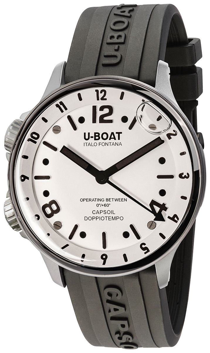 U-BOAT Capsoil Doppiotempo 45 mm SS White 8888/B i AISI-standardiserad kirurgisk stål och en urtavlan som är inbäddad i olja och utrustad med dubbeltid och tydliga indexmarkörer fyllts med SuperLuminova.