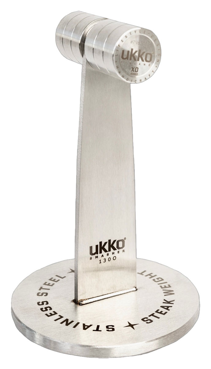 Ukko Smasher 1300 + Smoky Whisky RUB är ett mästerverk från finska svarvare, som hjälper dig att göra världens bästa biffar på grillen eller i gjutjärnspannan. Den är tillverkad genom svarvning och svetsning av 100 % livsmedelsgodkänt stål (AISI304). Ukko Smasher har en totalvikt på 1,3 kg och ett svarvat handtag i massivt stål (390 g) som ger ett fast grepp och ingen värme vid användning. För en perfekt finish har pressen en jämnt slipad bas (700 gr) som plattar till biffköttet, vilket gör biffen perfekt. Skivan är 120 mm i diameter och 8 mm tjock. Ukko Smasher 1300 är maskindiskbar.