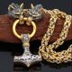 Varia Design Golden Valhalla halsband silver-guld i rostfritt stål med Thors hammare och Odins vargar. Kedjas längd är 60 cm, tjocklek 7 mm, berlockens storlek är 45 x 32 mm. Vikt: 160 g. Varia Design vikingasmycken skickas hem i tillverkarens originalförpackning.