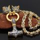 Varia Design Golden Wolves halsband silver-guld i rostfritt stål med Thors hammare och Odins vargar. Kedjas längd är 60 cm, berlockens storlek är 45 x 32 mm. Vikt: 160 g. Varia Design vikingasmycken skickas hem i tillverkarens originalförpackning.