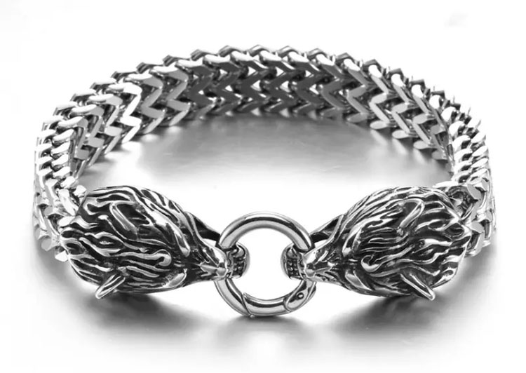 Varia Design Pansar Wolves armband i rostfritt stål med Odin vargar. Armbandet är 23 cm i längd. Varia Design vikingasmycken skickas hem i tillverkarens originalförpackning.