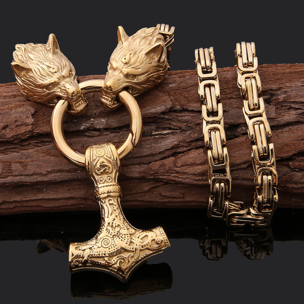 Varia Design Pure Golden Wolves halsband med Odins vargar Greke och Freke. Kedjas längd 70 cm, berlocken mått 45 x 32 mm. Varia Design smyckena skickas hem i tillverkarens originalförpackning.