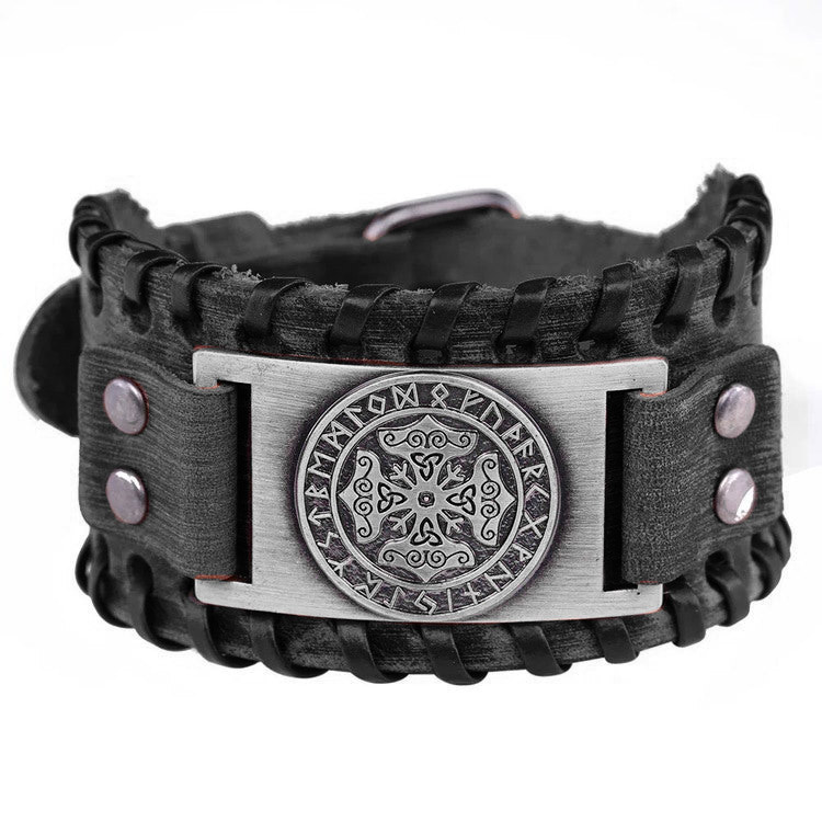 Varia Design Runa armband silver i svart läder med runor och stridyxor. Armbandet är justerbar mellan 19-23,5 cm. Varia Design vikingasmycken skickas hem i tillverkarens originalförpackning.