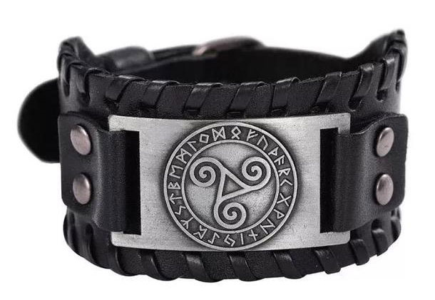 Varia Design Triskelion armband silver i svart läder med symbolen Triskele. Armbandet är justerbar mellan 19-23,5 cm. Varia Design vikingasmycken skickas hem i tillverkarens originalförpackning.