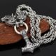 Varia Design Valhalla halsband silver med Tors hammare, Mjölner och Odins vargarna, Freke och Gere. Kedjas längd är 60 cm, tjocklek 7 mm, och berlockens storlek är 45 x 32 mm. Vikt: 160g. Varia Design vikingasmycken skickas hem i tillverkarens originalförpackning.