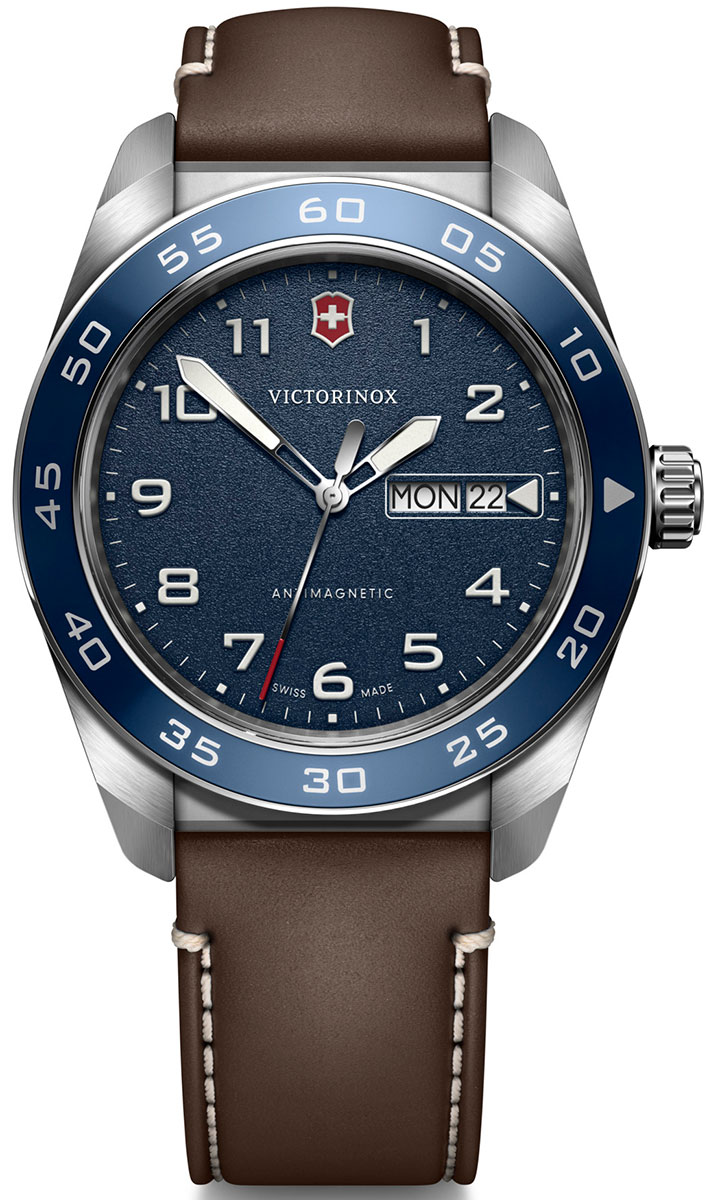 Den blå urtavlan på Victorinox Swiss Army 242040 batteridrivet armbandsur för män framhäver datum och veckodag vid klockan 3, vilket är lätt att läsa även med en snabb blick. Klockan har en boett i rostfritt stål med en bredd på 42 mm och en tjocklek på 10,55 mm. Urtavlan har antireflekterande safirglas och upplysta visare och index gör det lättare att avläsa tiden i mörker. Klockan har ett brunt band av äkta läder som är 21 mm brett. Victorinox Swiss Army 242040 tillhör vattentäthetsklassen 100m / 10atm, vilket betyder att den är lämplig för ytsim och snorkling.