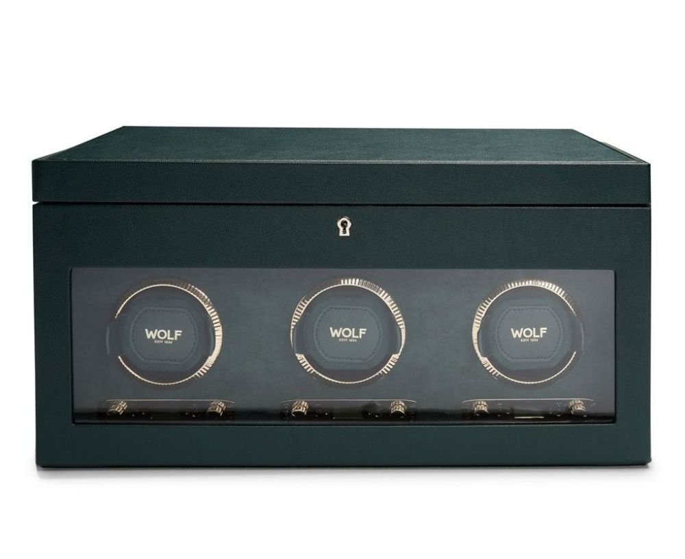 WOLF British Racing 3 klockor watch winder klockuppdragare 792341 har ett patenterat varvräkningssystem och en låsbar dynamisk manschett som "låser" klockan för att säkerställa att den sitter säkert på plats. Lågdensitetsskum är lämpligt för alla klockor utan att sätta press på armbandet. Din klocka återgår till sitt ursprungliga läge när rotationsprogrammet är klar. Denna klockuppdragare är för 3 klockor, och har extra rum för 1 extra klocka och en resväska för smycken.
