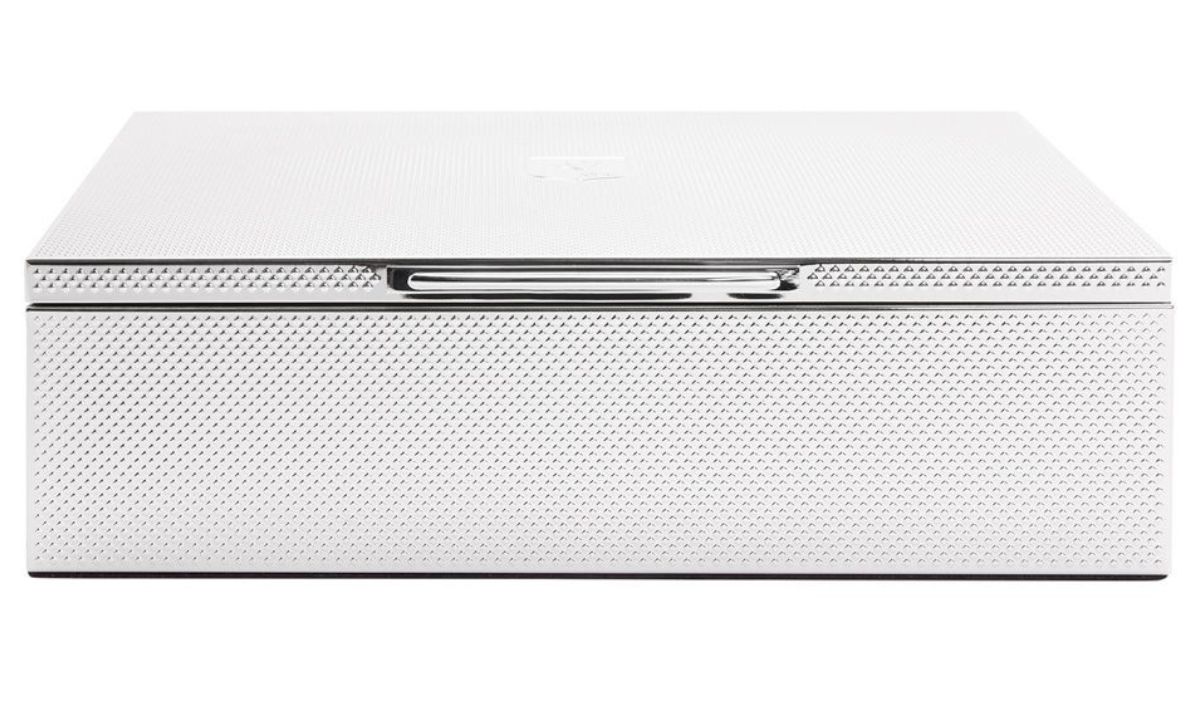 WOLF Silver silverpläterat klock- och smyckeskrin 190001 har WOLFs exklusiva 190-årsjubileumslogotyp graverad på toppen, baksidan och insidan av locket, och har ett maskingraverat mönster på utsidan. Looken avslutas med ett pianogångjärnslock och äkta silverplätering.